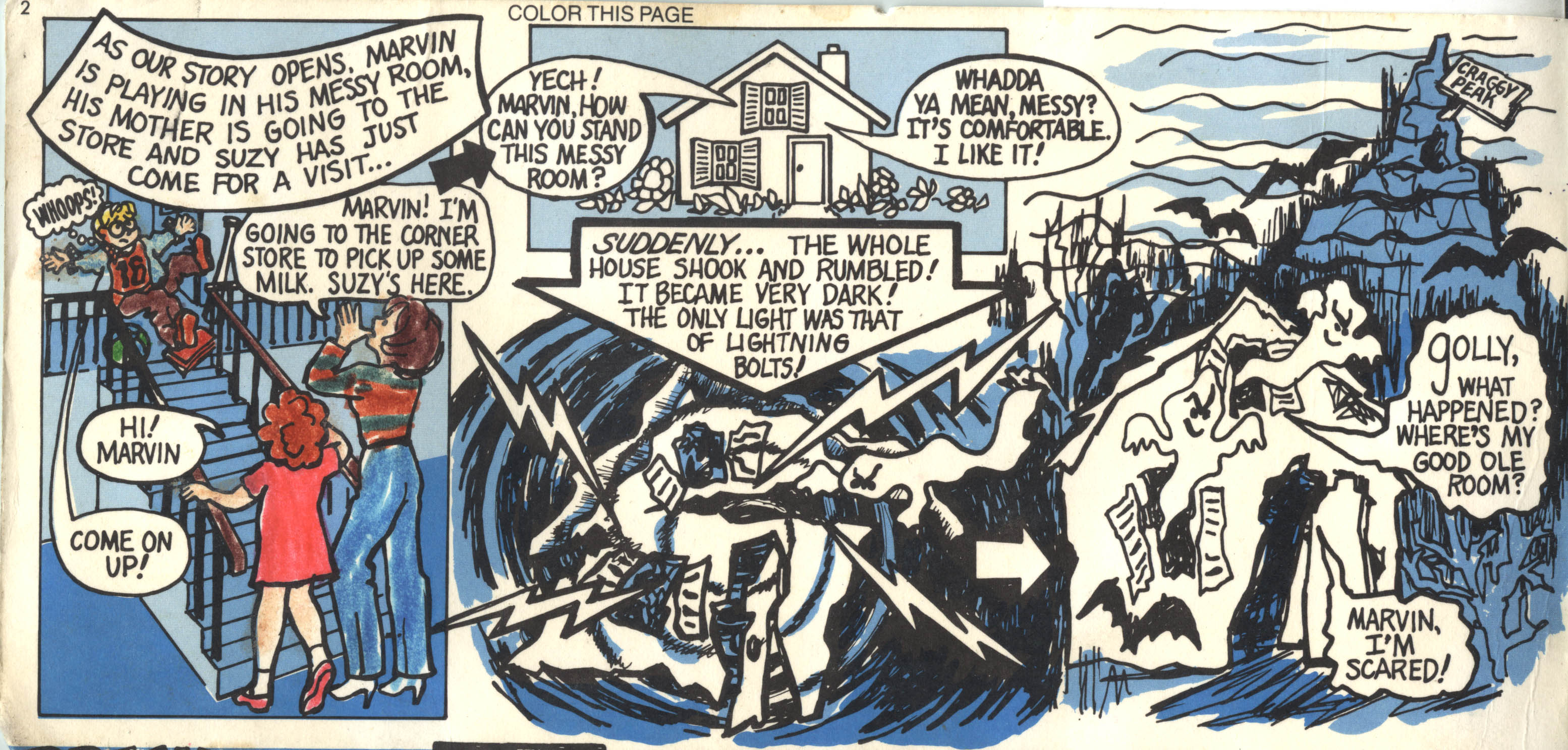 What follows are scans of all the pages in a retro Hershey’s promotional comic story book featuring Messy Marvin. This is apparently the top story portion, separated by perforations, from a larger activity book. (This explains the perforation-bumps running along the bottoms of all pages — and some color bleed.)